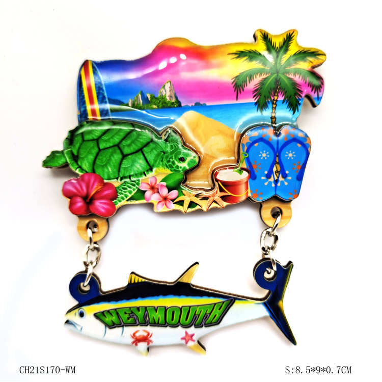 3D адаптивен средиземноморски дизайн сувенирен магнит за хладилник. Отличава се с уникален стил на форма с прикрепена верига, идеален за плажен туризъм. Изработен от висококачествени материали и здрава магнитна подложка, той предлага както декоративен чар, така и практична функционалност за всяка магнитна повърхност.