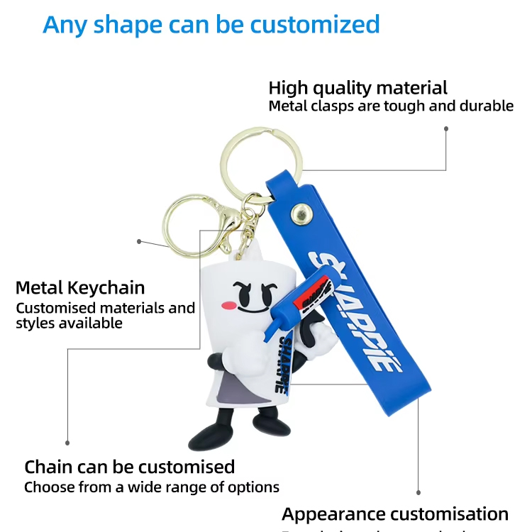 Вдъхнете живот на вашата марка или идея с напълно персонализирани 2D или 3D дизайни. Независимо дали става въпрос за лого, талисман или слоган, нашите меки PVC ключодържатели са пригодени да отговарят на вашата визия с жив цвят и висока детайлност.