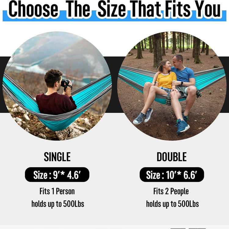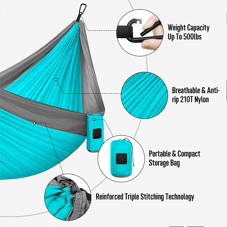 Къмпинг хамак Двоен и единичен преносим хамак. Вашата най-добра универсална система за релаксация за приключения на открито. Този къмпинг хамак побира както двойни, така и единични потребители с адаптивния си дизайн. Допълнен с професионални ремъци за дърво, този лек найлонов хамак с парашут осигурява максимален комфорт и преносимост.