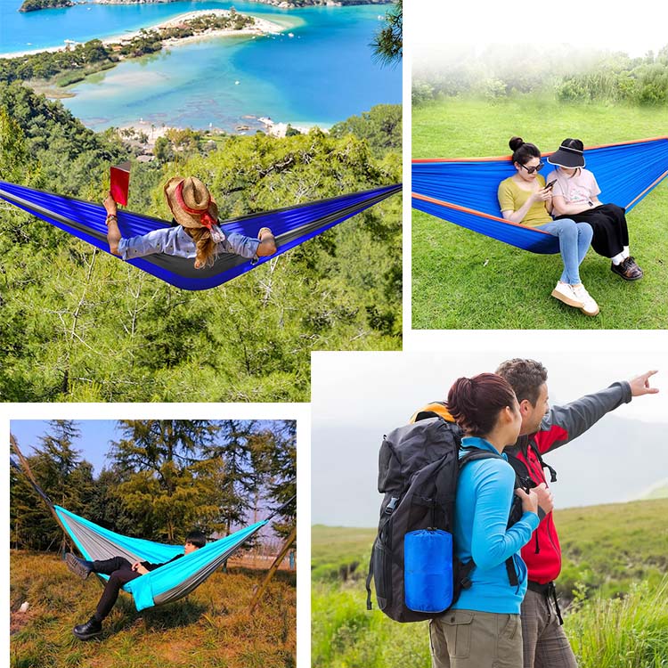 Къмпинг хамак Преносим хамак на открито закрит единичен. Вашето най-добро преносимо място за почивка както на закрито, така и на открито. Този многофункционален хамак е експертно проектиран за солови приключения или уютни моменти за двама. Неговият лек дизайн, който може да се опакова, го прави основен спътник за всяко къмпингуване или бягство в задния двор.