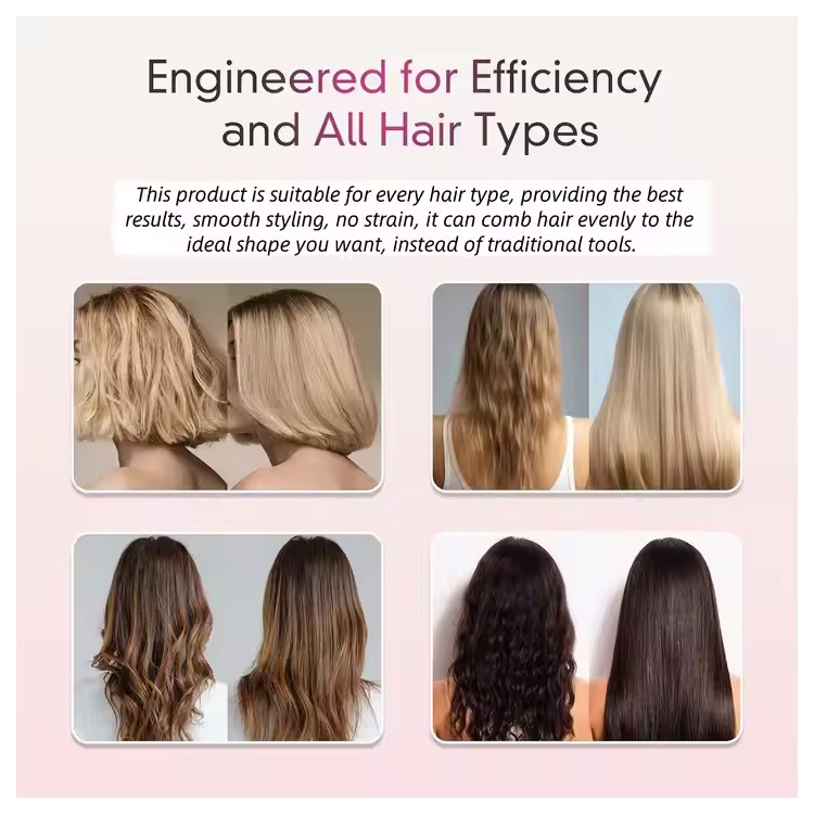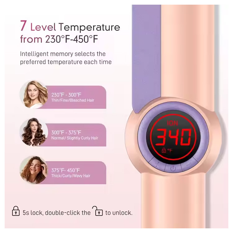 Разполага с персонализируеми настройки за топлина, за да отговарят на фина, средна или груба коса. Независимо дали изправяте, къдрите или къдрите, можете да изберете идеалната температура за ефективно оформяне, без да рискувате топлинно увреждане.