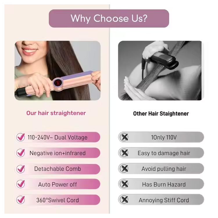 Високоефективна преса за коса с широки плочи Плоска ютия. Високоефективна инфрачервена преса за коса с 1,3 инча широки керамични плочи и технология с отрицателни йони. Осигурява гладко оформяне без къдрене с равномерно разпределение на топлината. Идеален за гъста, къдрава или трудна за поддържане коса. Професионални резултати у дома.