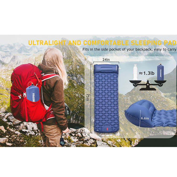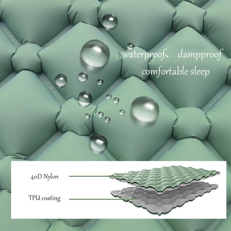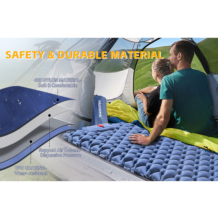 Сгъваема подложка за къмпинг палатка от лек найлонов материал. Вашето най-добро преносимо решение за сън за приключения на открито. Този свръхлек надуваем матрак разполага с надуване с едно натискане и интегриран дизайн на възглавницата. Изработен от издръжлив найлонов материал, той осигурява превъзходен комфорт за туризъм и къмпинг, осигурявайки спокойни нощи навсякъде.