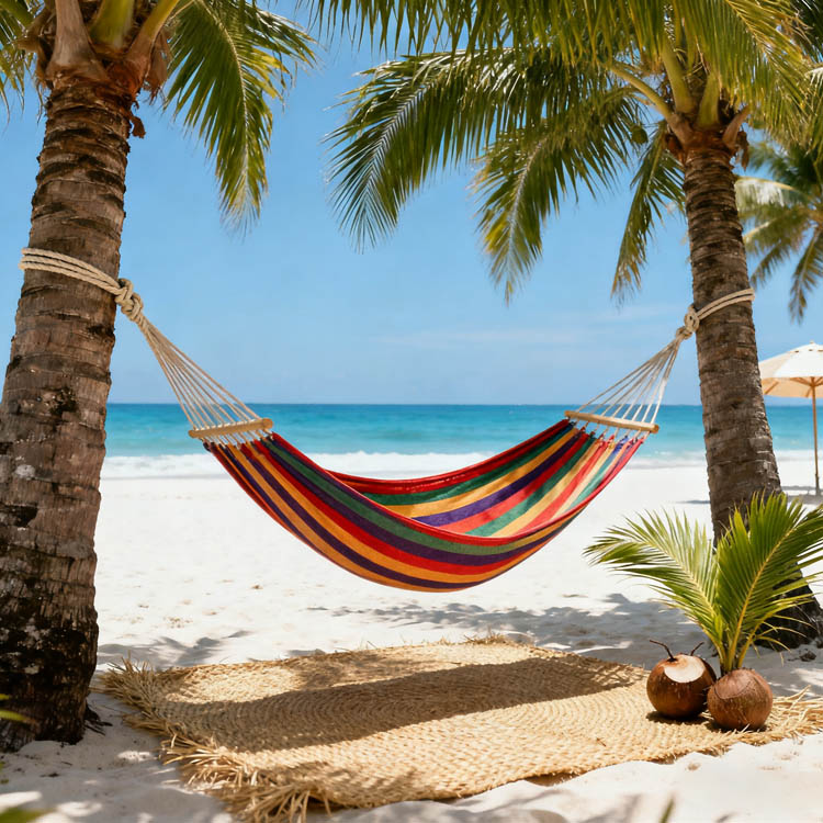 Удобен платнен хамак за къмпинг за 2 души. Вашето идеално самостоятелно бягство за приключения на открито. Този хамак за къмпинг за един човек включва издръжлива конструкция от тафта с тъмни карабинери и регулируеми презрамки за дърво. Проектиран за максимален комфорт и лесна настройка, той е вашият идеален спътник за почивка в пустинята.
