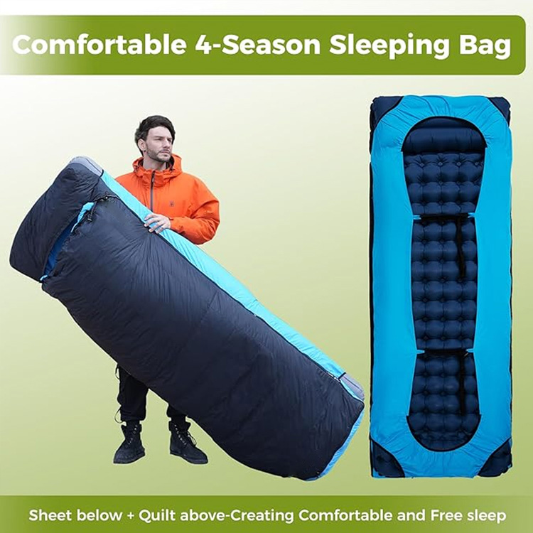 Свръхлеко пухено одеяло за къмпинг, подложка за спане с патешки пух. Вашата най-добра система за сън за четири сезона за приключения в пустинята. Този свръхлек пухен спален чувал съчетава първокласна изолация от патешки пух с вградена надуваема подложка. Функционирайки едновременно като юрган и спален чувал, той осигурява максимална топлина без компромис с теглото.