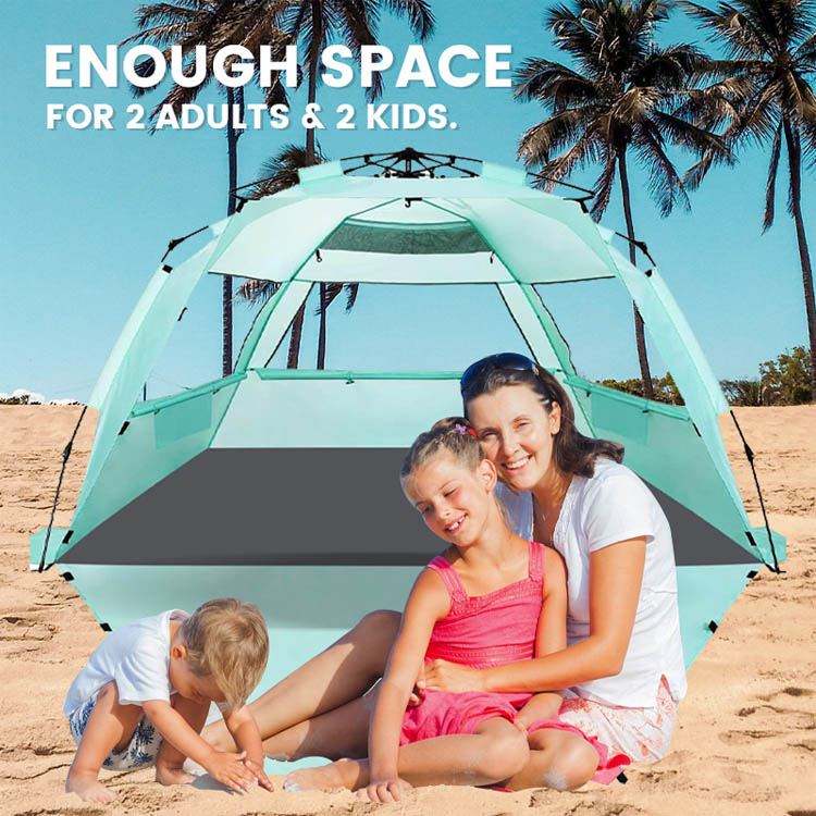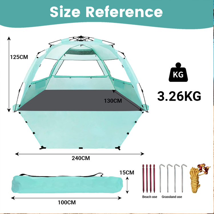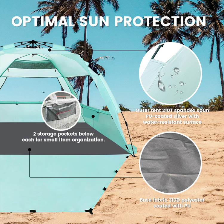Специализирана тъкан със сребърно покритие блокира 98% от вредните UV лъчи, като същевременно поддържа отличен въздушен поток, създавайки хладна сенчеста зона за продължителен престой на плажа.